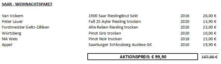 Bald schon ist Weihnachten, ein guter Anlass um mit der Familie und Freunden mit ein paar herrlichen Saarweinen anzustoßen! Beschenken Sie sich selbst und genießen Sie über die Feiertage einige dieser auserwählten Spitzenweine - wie immer bei uns zu Winzerpreisen.